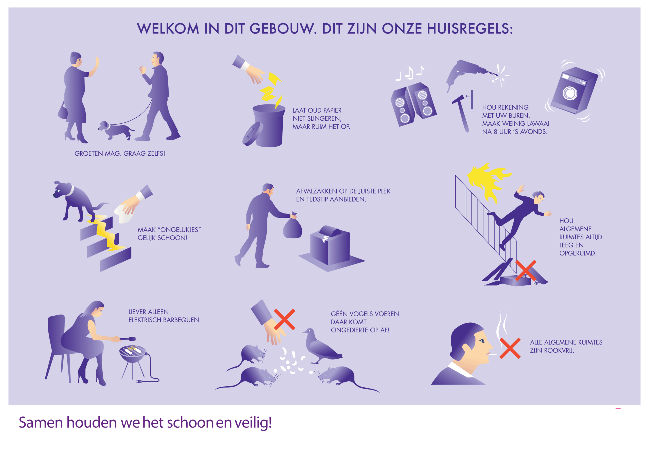 In gemeenschappelijke ruimtes gelden regels. Regels om te zorgen dat het er verzorgd en schoon blijft, dat bewoners geen last van elkaar hebben en dat het er veilig is. Voor bewoners zelf hebben deze regels meestal geen prioriteit en vaak weten ze ook niet welke regels er gelden. Soms hangen er een perspex bordje of een ingelijst A4-tje met daarop wat verboden en geboden; zonder samenhang en niet aantrekkelijk vormgegeven. Bewoners merken de informatie vaak niet eens op.